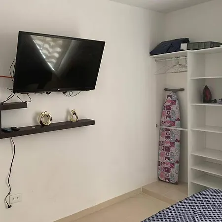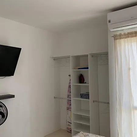 Los electrodomésticos de la cocina incluyen un horno de microondas y estufa en una cocina. La distancia al aeropuerto Nacional de Isla Mujeres es de unos 20 km.
